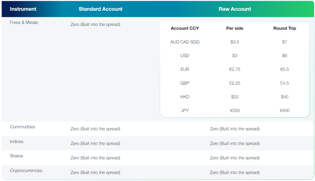 Check our commission charges for the RAW ECN account, based on the currency denomination of your